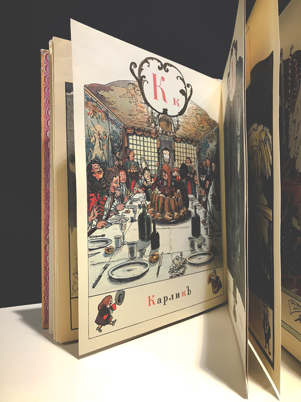 Притягивает взгляд «Азбука в картинках Александра Бенуа» (СПб., 1904), непревзойденный образец русской книжной графики. Бенуа создал веселую, красивую детскую книжку, преследующую не только учебные, но и развлекательные задачи. Иллюстрации художника развивают образное мышление и зрительную память, речь и эстетический вкус и, конечно, привлекают к изучению алфавита, помогают создать прочные ассоциативные связи между буквой, словом и изображением.