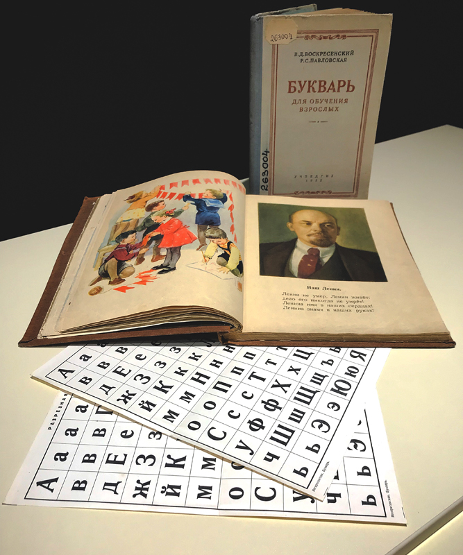 Советские буквари, созданные для обучения взрослого населения, отличались ярко выраженной идейно-воспитывающей направленностью. В них, как в зеркале, отражались главные события советской жизни: страницы пестрели лозунгами, короткие заметки повествовали о революции, съездах Советов, планах и хлебозаготовках, воспевали ратные подвиги советских солдат.