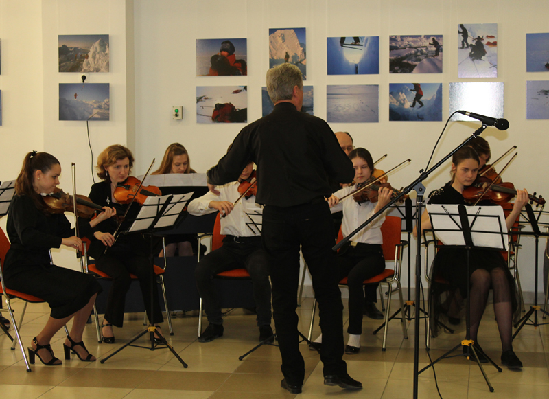 Выступление камерного оркестра Детской музыкальной школы №1 (руководитель – заслуженный работник культуры РФ Николай Панин) стало музыкальным подарком для гостей встречи, а кадры документального фильма «Icewalk», возможно, помогли нам понять, что заставляет человека бросать свой уютный дом, близких людей и уходить во льды Арктики, к полюсу, навстречу неизвестности и опасности.