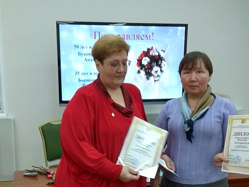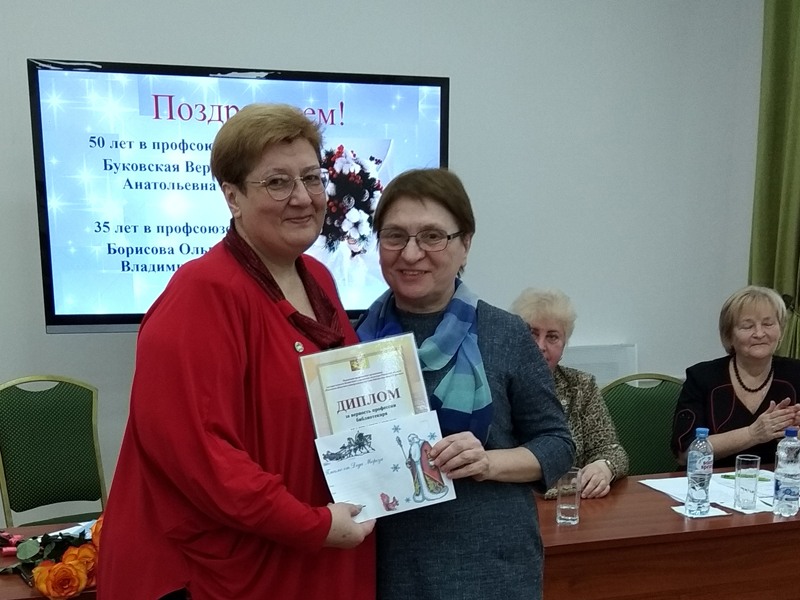От профкома дипломы за верность профессии вручены библиотекарям Ольге Владимировне Борисовой и Вере Анатольевне Буковской. Ольга Уласевич поблагодарила собравшихся за оказанное доверие и выразила надежду на плодотворную совместную работу.