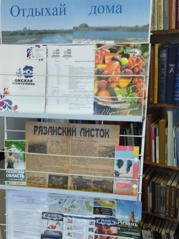 В отделе организационно-методической и образовательной деятельности РОУНБ им. Горького действует выставка «Отдыхай дома» с рекламными предложениями турагентств и санаториев Рязани, предоставляющими скидки и бонусы членам профсоюза.