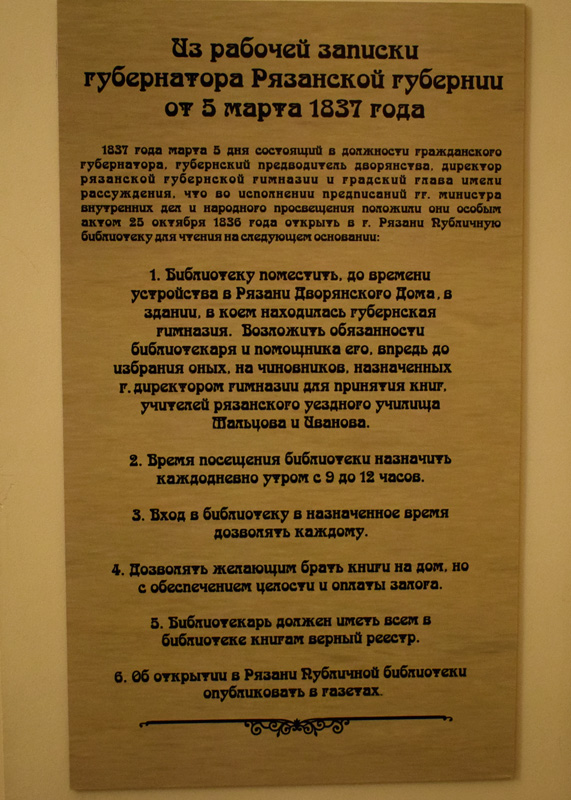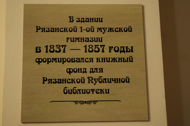 В 1837 – 1857 годы в здании 1-й мужской гимназии (где сейчас находится «Политех») формировался книжный фонд. Благодаря активной деятельности губернатора П.П. Новосильцева и директора училищ Ф.И. Шиллинга удалось собрать необходимые средства для организации Рязанской публичной библиотеки. В 1858 году состоялось ее открытие.