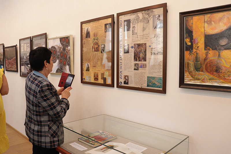Куратор выставки, ведущий библиограф краеведческого информационного отдела библиотеки Марина Алексеевна Абрамова выразила глубокую признательность Анастасии Георгиевне Гачевой за материалы, предоставленные для экспозиции, и неоценимую помощь в создании концепции выставки. Она отметила, что большой вклад в создание экспозиции внесли: заведующая научной библиотекой Рязанского государственного художественного музея им. И.П. Пожалостина Софья Константиновна Синяева, отобравшая для выставки альбомы и книги из фондов научной библиотеки музея о творчестве русских художников, обращавшихся к теме космизма; Председатель Рязанского отделения Союза художников России Виктор Леонидович Грушо-Новицкий, собравший работы сасовских художников А.Г. Ларюнина, М.В. Рытькова, А.А. Трухина, посвященные фёдоровским местам; член Рязанского отделения Союза художников России Максимилиан Анатольевич Пресняков, предоставивший для выставки не только свои работы на тему космизма, но и работы своей матери Людмилы Дмитриевны Пресняковой. Центральное место заняли три работы заслуженного деятеля культуры РФ, директора Рязанского художественного училища имени Г.К. Вагнера Василя Ивановича Колдина.