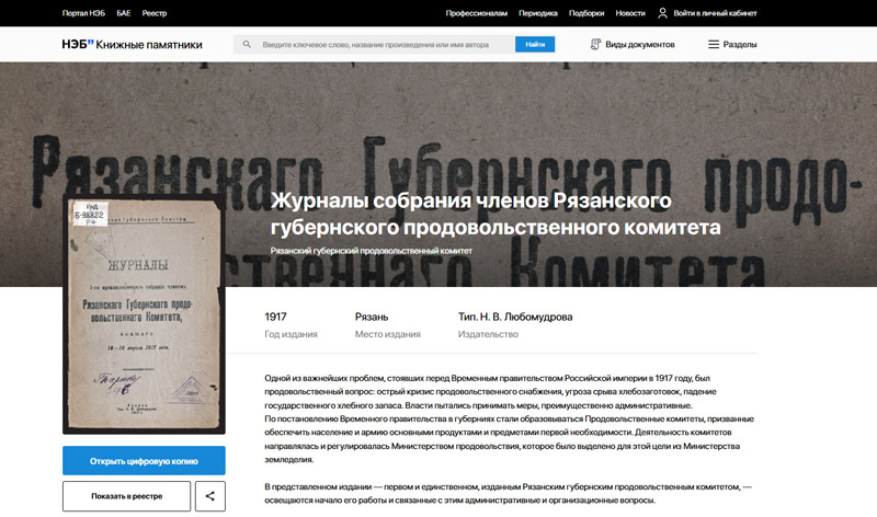 Очень редкой является небольшая брошюра «Журналы 1-го организационного собрания членов Рязанского губернского продовольственного комитета, бывшего 16-18 марта 1917 года». Это первое и, как в последствии оказалось, единственное издание Рязанского комитета, в котором освещаются начало его работы и связанные с этим административные и организационные вопросы.