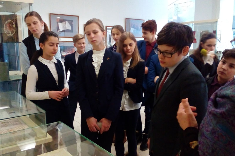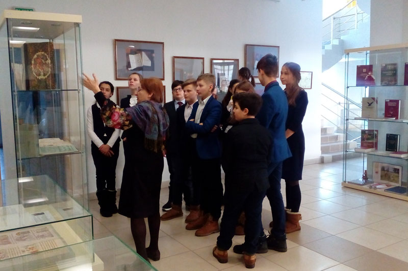 Встреча началась со знакомства с экспонатами выставки «Фонды. Читатели. Дарители», подготовленной к 160-летию главной библиотеки региона. Главный библиотекарь кафедры периодических изданий Вера Анатольевна Буковская познакомила ребят с книгами, подаренными нашей библиотеке в разные годы разными людьми. В числе даров – факсимильные издания Остромирова Евангелия и Радзивилловской летописи.