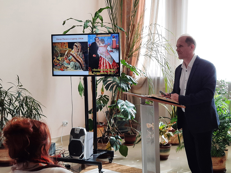 Ведущий арт-встречи Андрей Балашов рассказал также, что традиция дарить пасхальные яйца в день светлого Христова Воскресения, которую изобразил на своей картине «Христосование» Борис Кустодиев, появилась благодаря Марии Магдалине, пришедшей к иудейскому императору с вестью о воскрешении Христа. Об этом повествует и картина Александра Иванова «Явление Христа Марии Магдалине после воскресения». Таким образом, в преддверии праздника Пасхи были рассмотрены различные версии живописцев о евангельских историях.