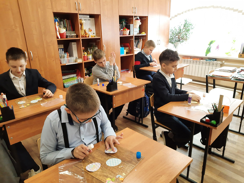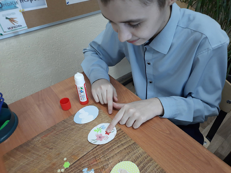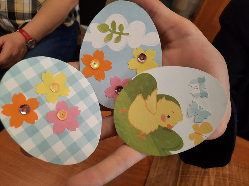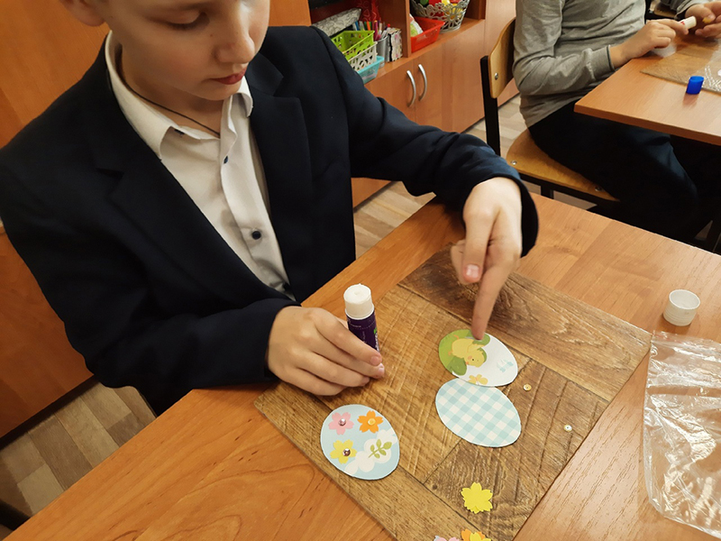 Ребята своими руками украсили корзинку и декоративные яйца, вырезанные из дизайнерской бумаги, стараясь соблюдать баланс цвета и композиции. Все участники творческой встречи остались довольны полученным результатом, полученные сувениры они обещали подарить своим близким в праздничный день Пасхи.