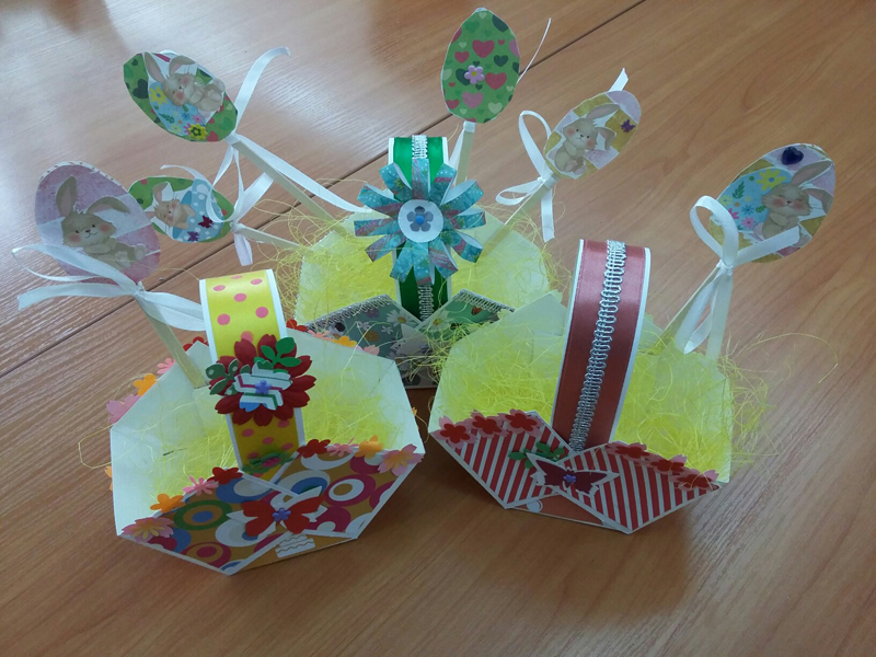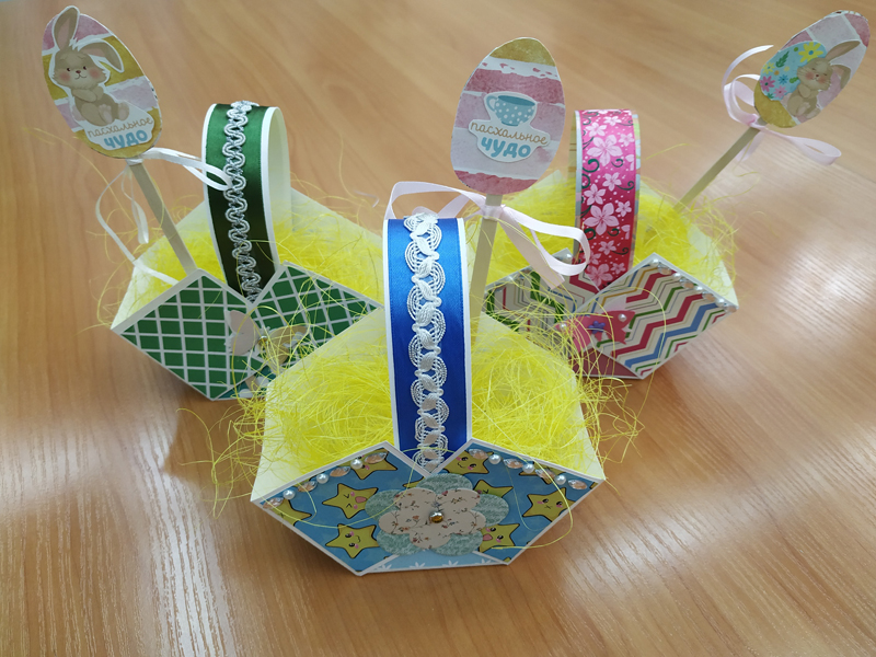 Как правило, на Пасху хочется поздравить родных и близких особенно тепло и душевно. И самый лучший подарок тот, что сделан своими руками. Участники творческого курса «Секреты бабушкиного сундучка» изготовили оригинальную корзинку для крашеных яиц и сладких угощений. Для работы им потребовались акварельная и дизайнерская бумага, ножницы, клей и карандаш, атласные ленты и тесьма, а также умелые руки, терпение и любовь.