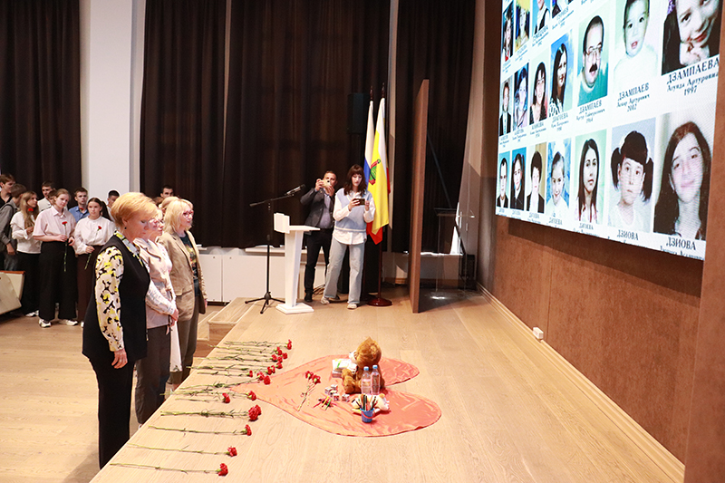 Участники мероприятия вспомнили трагические события сентября 2004 года, почтили память погибших минутой молчания и возложением цветов.