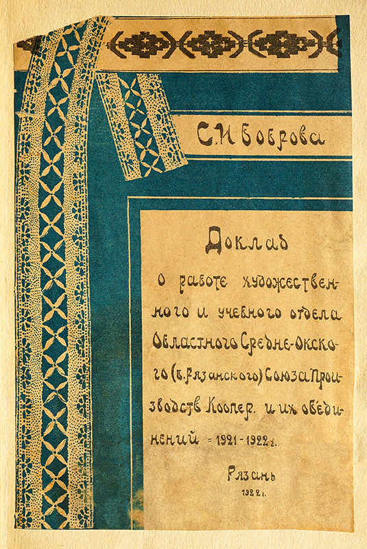 Рязанская земля издавна славилась народными традициями. Кустарные промыслы всегда занимали важное место в экономике нашей губернии. Наибольшее их количество приходилось на северные уезды, где производилась обработка дерева, развивались вышивание, вязание, сапожный, скорняжный и шорный промыслы. Около 8 тыс. кустарей вошли в состав Средне-Окского кустарьсоюза, созданного в мае 1921 г. для объединения и руководства работой потребительских и сельскохозяйственных кооперативов и организации новых артелей. В 1922 г. в серии «Материалы о промысловой кооперации Средне-Окского района» Союзом был издан доклад инструктора В. П. Никитина о Мосоловской артели кустарного производства мочальных изделий в Спасском уезде. В той же серии вышел доклад заведующей художественным и учебным отделом Средне-Окского кустарьсоюза С. И. Бобровой, в котором речь шла о кооперировании кружевниц в Рязанском, Михайловском и Скопинском уездах, об истории вышивального промысла и соломоплетения в Рязанской губернии.