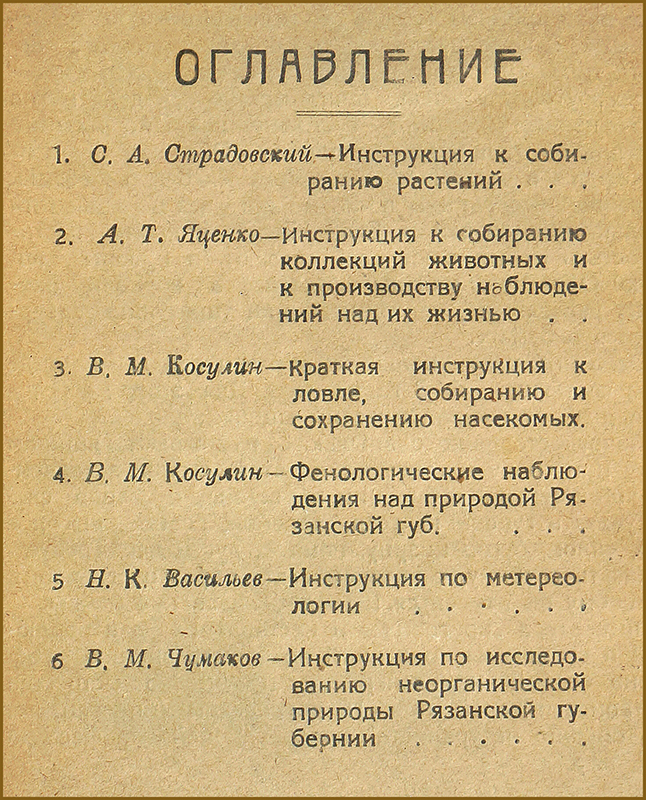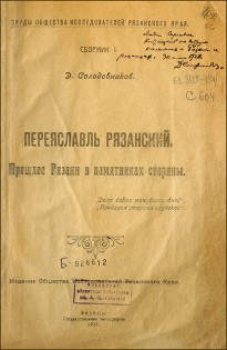 После Октября 1917 г. большой размах в стране приобрело краеведческое движение. В начале января 1920 г. в Рязани при Институте народного образования было создано Общество исследователей Рязанского края. Оно занималось изучением истории, экономики и географии Рязанской губернии, организовывало выставки и публичные лекции, печатало отчеты о своей деятельности – сначала в журнале «Вестник Рязанских краеведов» (1923–1925), а с 1926 г. – отдельными брошюрами. Общество издавало свои материалы по трем сериям. В нашей коллекции имеются первый выпуск из «Серии методической» – «Инструкция по собиранию материалов в естественноисторической области» (о сборе растений и насекомых, метеорологических и фенологических наблюдениях и исследованиях) – и первый сборник из серии «Труды» «Переяславль Рязанский. Прошлое Рязани в памятниках старины». Автор этой монографии – Дмитрий Дмитриевич Солодовников (1872 – 1944), фигура едва ли не самая удивительная в рязанском краеведении: талантливый педагог и популяризатор истории, организатор краеведческой и музейной работы. За обширные знания его называли «профессором Рязанского края». Он закончил работу над своей книгой в 1918 г., но издана она была только в 1922-м – под скромной обложкой, на дешевой бумаге, без иллюстраций. Для страны, только что пережившей тяготы Гражданской войны, был удивителен сам факт появления подобного издания. Книга знакомит читателя с различными эпизодами из истории Рязани (до 1778 г. – г. Переяславль Рязанский), начиная с древних археологических находок и существования Рязанского княжества и заканчивая губернским периодом XIX – начала XX вв. Написанная «для людей простых, не ученых», она доступно, хорошим литературным языком рассказывает о богатом историко-культурном наследии Рязани: памятных местах, церковной старине, архитектуре и исторических реликвиях, о городских меценатах и знаменитых земляках. Неустаревающее содержание труда «Переяславль Рязанский. Прошлое Рязани в памятниках старины» стало главным аргументом для его переиздания в 2016 г.