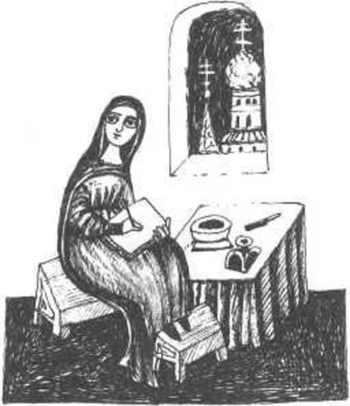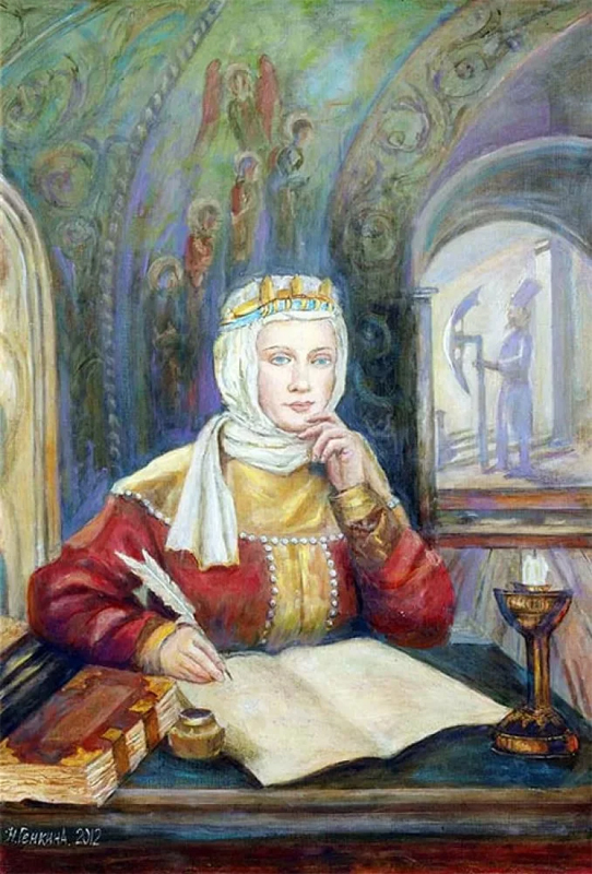 Попробуем представить себе княгиню Марию над листами летописи: она сидит на «стульце», положив летопись на колени. Рядом с ней на низком небольшом столике письменные принадлежности. Она пишет в отдельных тетрадях, то есть согнутых в два, в четыре раза листах пергамента или бумаги, которые потом переплетаются в книгу. В тексте оставлено место для заставок, инициалов, миниатюр, которые сделает потом художник. Княгиня вспоминает дорогие ей лица и пытается сохранить их для нас, ее далеких потомков.
