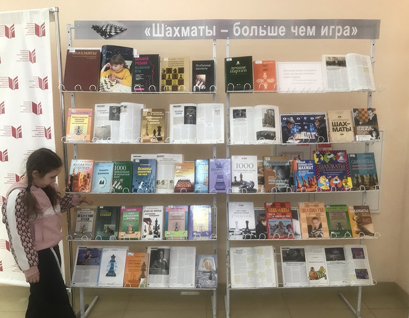 К мероприятию сотрудники библиотеки подготовили книжную выставку «Шахматы – больше чем игра». Экспозиция рассказывает об истории шахмат, о шахматных партиях, о соревнованиях и известных шахматистах.