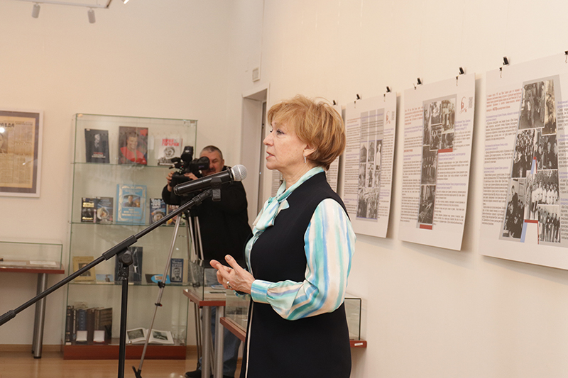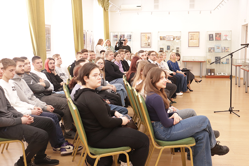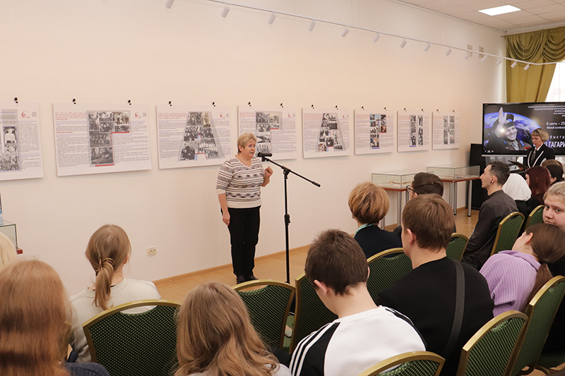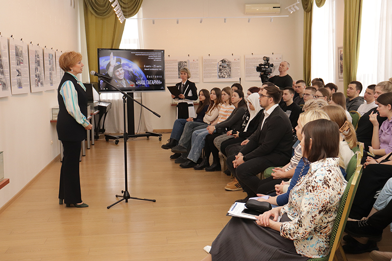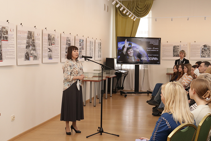 Обзор книжной выставки провела сотрудник библиотеки Марина Алексеевна Абрамова. Она познакомила слушателей с богатым книжным фондом библиотеки, с уникальными экспонатами, рассказывающими о личности Юрия Гагарина, о времени, в котором он жил, о первых достижениях отечественной космонавтики.