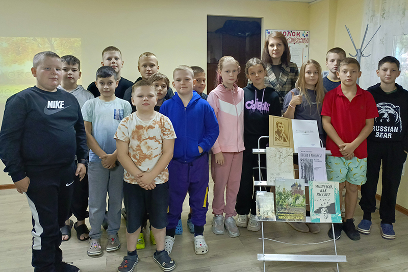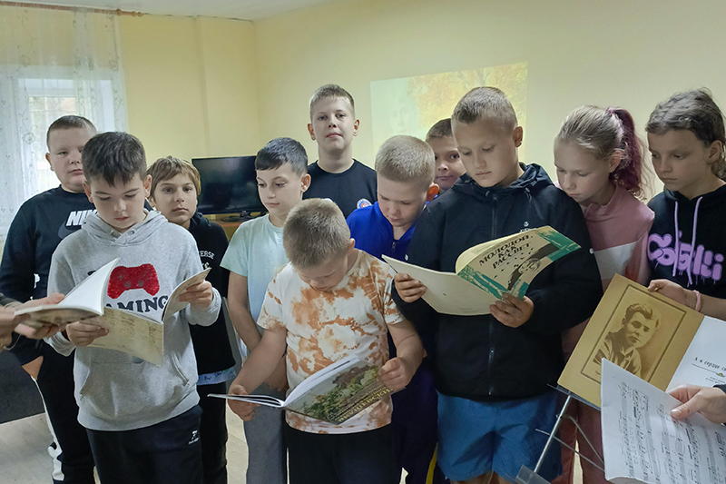 Воспитанники лагеря узнали интересные факты из биографии Сергея Есенина и услышали песни на его стихи в исполнении известных артистов: Иосифа Кобзона («Ах, какая песня родом из Рязани»), Александра Малинина («Письмо матери»), Николая Баскова («Капли жемчужные»), Сергея Безрукова («Листья падают»), а также Государственного академического Рязанского русского народного хора имени Е. Попова («Над окошком месяц», «Спит ковыль»).