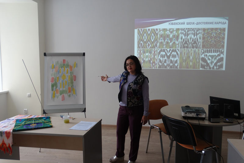 Приятным сюрпризом для гостей стал мастер-класс «Экоикат», организованный председателем Рязанской местной узбекской национально-культурной автономии «Алмаз»» Зулайхо Кадировой. Ребята услышали рассказ о знаменитой на весь мир узбекской ткани «хан-атласе». В рисунке этой ткани прослеживается характер узбекского народа, его национальный художественный вкус. А цветовая палитра и шелковая фактура символизируют добросердечие, энергию и оптимизм. Участники мастер-класса попробовали создать свой орнамент и отразить в нем цветовое видение природы, как в легенде о «хан-атласе».