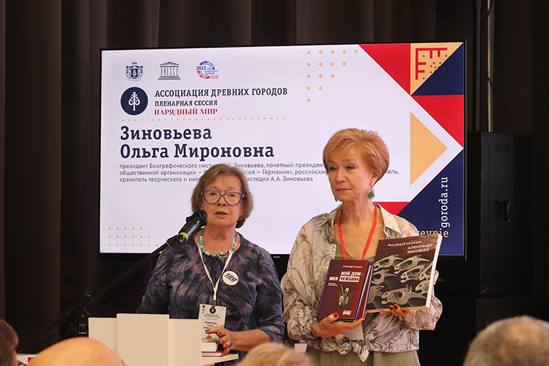 Президент Биографического института Александра Зиновьева, российский общественный деятель, жена, соратник, хранитель творческого и интеллектуального наследия Александра Александровича Зиновьева, 100-летие со дня рождения которого в этом году отмечает просвещенное сообщество, Ольга Мироновна Зиновьева подчеркнула, что «Форум древних городов – событие громадного значения» для сохранения самобытной культуры народов мира. Ольга Мироновна преподнесла в дар областной библиотеке имени Горького альбом работ Александра Александрович Зиновьева «Рисующий писатель» и серию его книг.