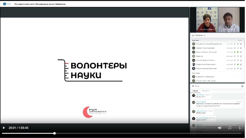 На вебинаре также говорили о методах привлечения молодежи к научным проектам и эффективных формах сотрудничества библиотек с волонтерскими организациями. Все участники вебинара отметили важность популяризации науки для повышения интереса среди детей и молодежи к научной сфере, уровня образованности населения и формирования научного мировоззрения.
