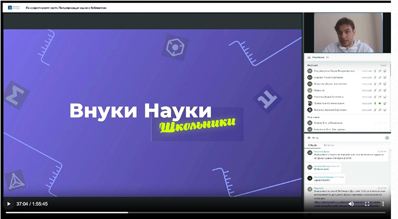 25 февраля состоялся первый вебинар – «Популяризация науки в библиотеке», где Никита Попов, заведующий региональным центром социокультурных проектов, рассказал о работе волонтеров науки в Рязанской области. Поделился со слушателями опытом проведения Первой региональной школы волонтеров науки «Внуки Циолковского», организации конкурса детских и молодежных изобретений «Научный-нескучный», создания в Рязанской области сообщества волонтеров науки на базе областной универсальной научной библиотеки имени Горького. Его доклад вызвал живой интерес аудитории.