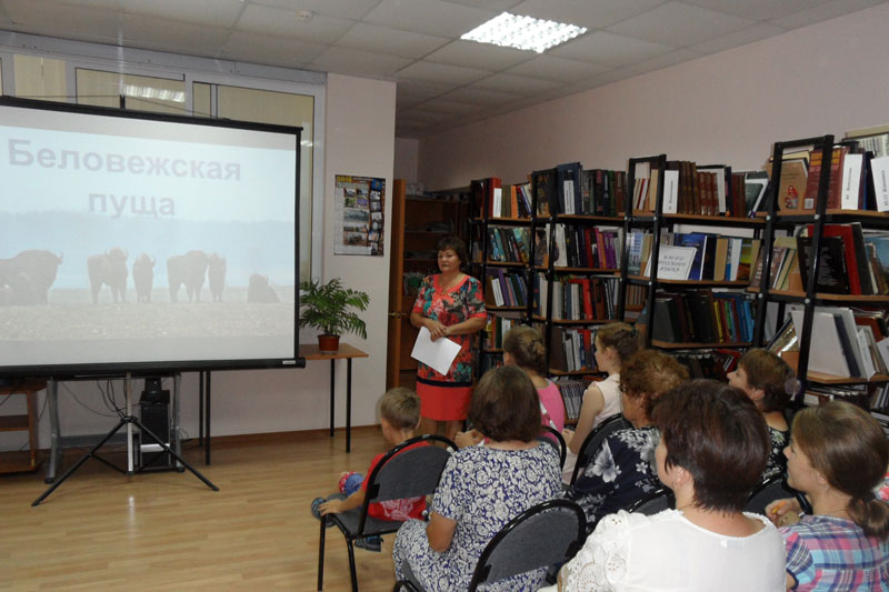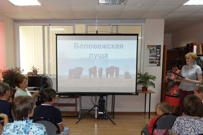 Гости библиотеки услышали рассказ о самом большом охраняемом лесном массиве Европы, включенном в список Всемирного наследия ЮНЕСКО. Они узнали об истории этого национального парка, его символике, исторических памятниках, представителях флоры и фауны, а также о самых важных его обитателях – зубрах. Неподдельный интерес вызвали видеокадры о жизни обитателей зубропитомника. Читатели Путятинской библиотеки окунулись в неповторимую атмосферу заповедного леса, описанного в книге очерков Георгия Скребицкого и Веры Чаплиной «В Беловежской Пуще» и знаменитой песне Александры Пахмутовой на стихи Николая Добронравова.