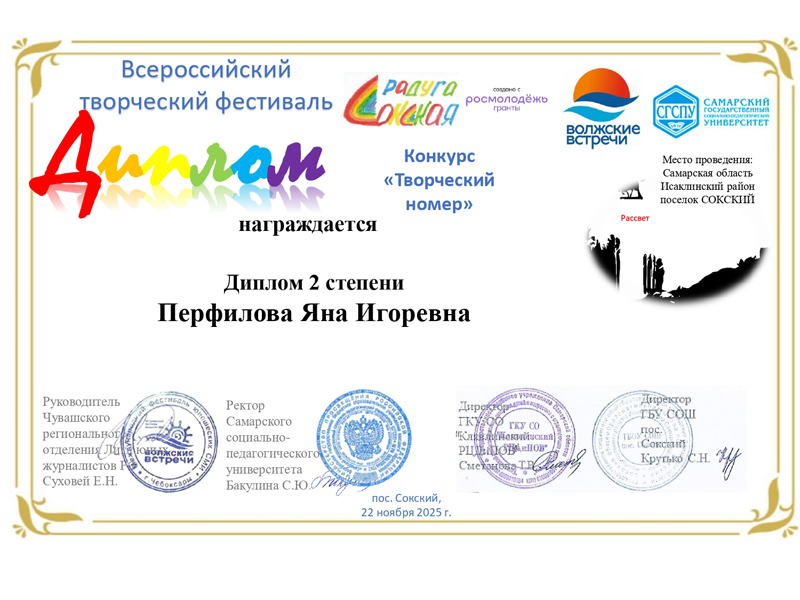 Участники клубного формирования «Любительский театр “Атмосфера”» отмечены дипломами Всероссийского творческого фестиваля «Сокская радуга» (Самарская область).