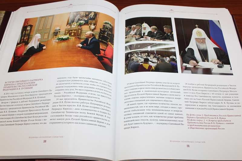 Альбом «Патриарх Кирилл. 10 лет Первосвятительского служения» посвящен 10-летию Поместного собора Русской православной церкви и патриаршей интронизации 2009 года и рассказывает о самых важных вехах пути патриаршего служения год за годом, от интронизации до сегодняшнего дня. Здесь архив новостей и официальных сообщений, выдержки из проповедей, сообщений и докладов Святейшего Патриарха по самым острым и актуальным вопросам жизни Церкви и общества, репортажи о поездках главы Русской православной церкви. Книга издана ограниченным тиражом на высочайшем полиграфическом уровне, в издании использованы более 1000 фотографий из различных архивов.