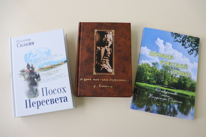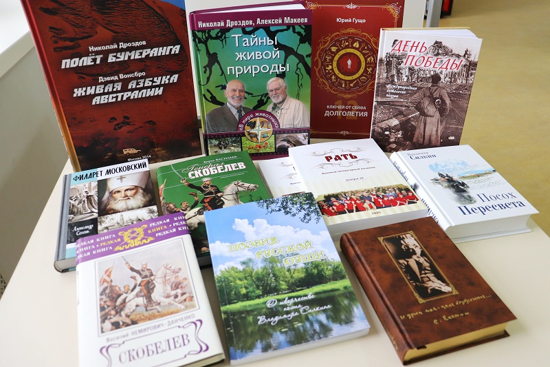 Среди подаренных сегодня, книги наших земляков и книги о наших земляках: прекрасно изданный сборник стихов Сергея Александровича Есенина «И душа моя – поле безбрежное…»; «Полет бумеранга» и «Тайны живой природы» Николая Николаевича Дроздова; сборник стихов уроженца г. Ряжска Владимира Александровича Силкина «Посох Пересвета» и сборник «Поэзия русской души» о творчестве В.А. Силкина; книги В. Немировича-Данченко и Б. Васильева о генерале М.Д. Скобелеве; диск и флеш-карта с записями гимна Рязанского землячества в разных исполнениях.