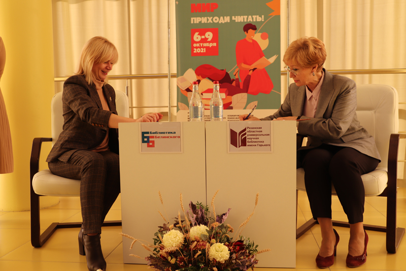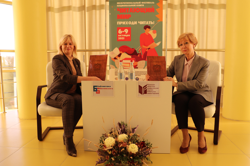 8 октября в рамках межрегионального фестиваля «Читающий мир» на одной из площадок библиотеки имени Горького состоялось подписание соглашения о сотрудничестве и взаимодействии в целях развития и укрепления межрегионального сотрудничества между Государственным бюджетным учреждением культуры Калужской области «Калужская областная универсальная научная библиотека им. В.Г. Белинского» (г. Калуга) и Государственным бюджетным учреждением культуры «Рязанская областная универсальная научная библиотека им. Горького» (г. Рязань).