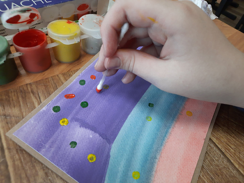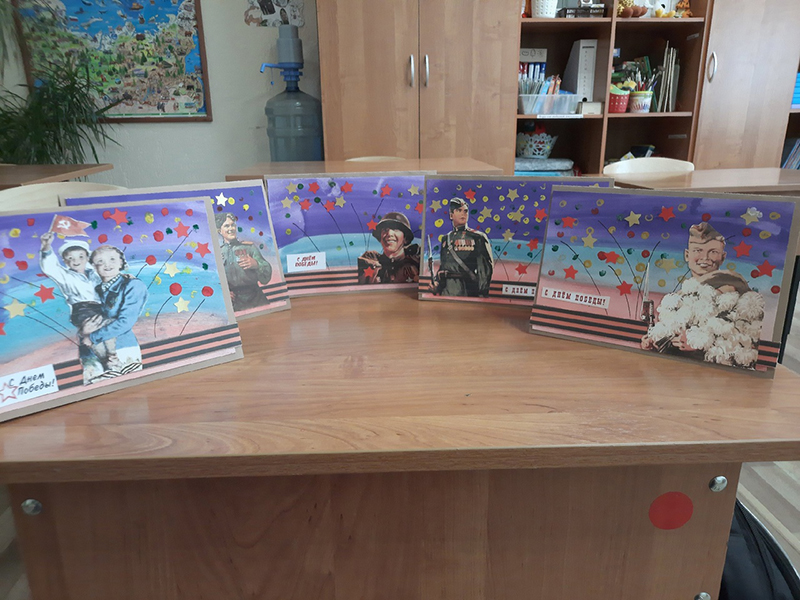 Героями поздравительных открыток ребят стали герои, которых когда-то запечатлели советские художники на своих плакатах. Фон для открыток мальчишки и девчонки делали сами, при помощи цветной гуаши и ватных палочек они нарисовали настоящий фейерверк, который традиционно запускают по всей нашей стране в праздничные майские дни.