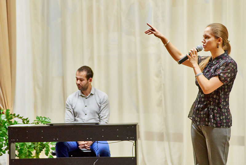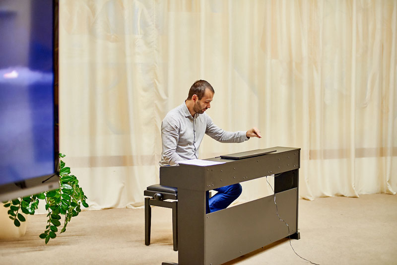 Знакомство с прекрасным поэтическим слогом молодой поэтессы сопровождалось не менее прекрасной игрой уже известного в Рязани молодого композитора, пианиста Андрея Синецкого. Андрей не первый раз выступает на библиотечной сцене и каждое его выступление похоже на щедрый подарок всем слушателям. Андрею удалось найти характерное настроение для каждого стихотворения, звучавшего со сцены.