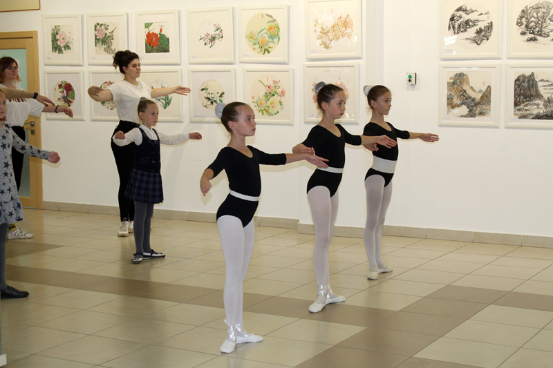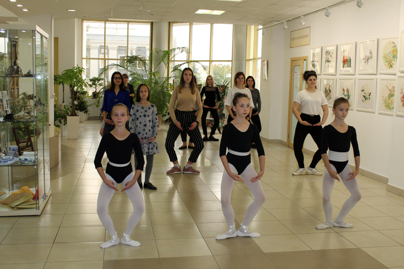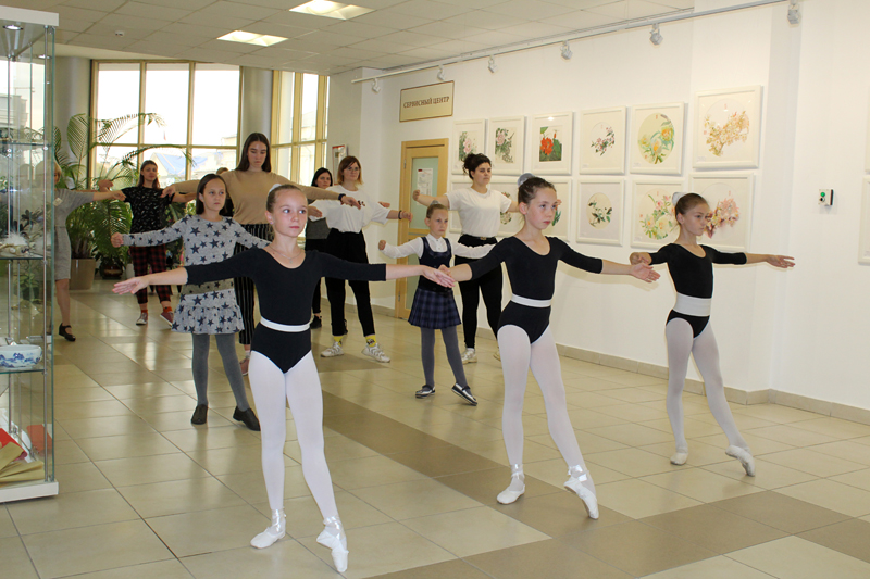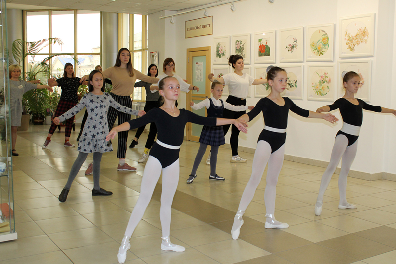 Ученицы 3 класса Елизарьева Полина, Размахнина Полина и Булатникова София вместе с руководителем школы, Ольгой Юрьевной Шульгой, показали начальные этапы обучения классическому танцу, рассказали об истории балета, особенностях танцевальной обуви. Все желающие смогли разучить балетных движений.