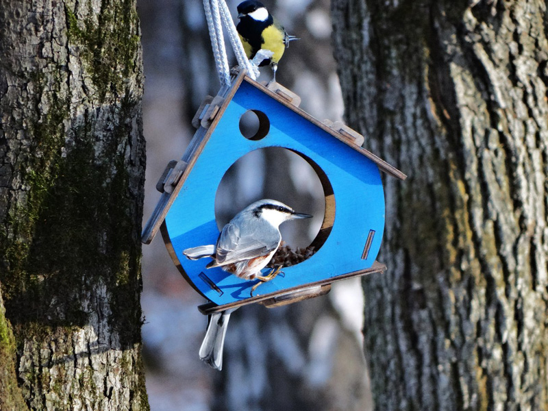 Птичек можно угощать нежареными семенами подсолнечника, тыквы и арбуза, сушеными ягодами рябины, пшеницей, овсом, арахисом, несоленым салом. «Синичкины лакомства» придутся по вкусу снегирям, щеглам, свиристелям, чечеткам и другим птицам.