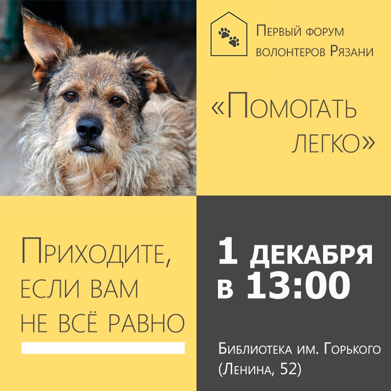 1 декабря в библиотеке им. Горького пройдет I Форум добровольцев «Помогать легко», посвященный проблеме бездомных животных в регионе и поиску путей ее решения.
