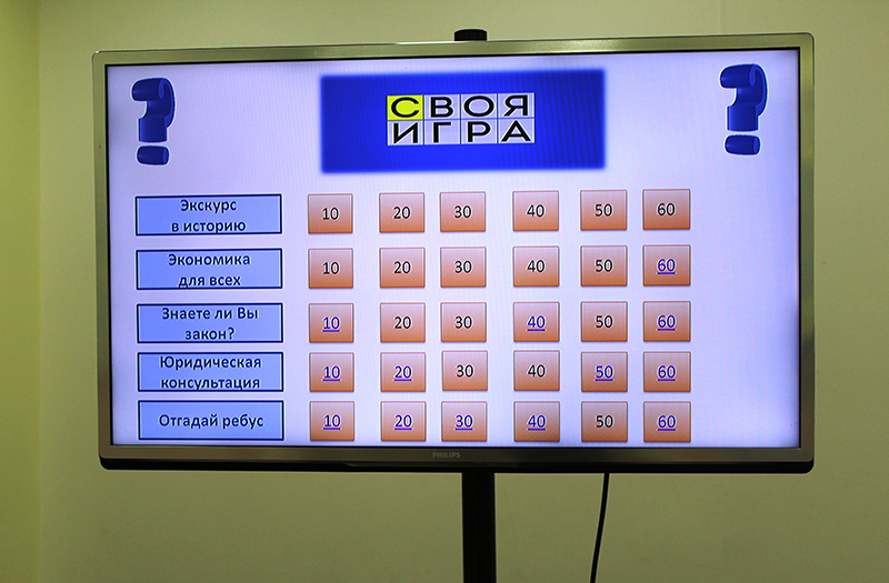 Семинар прошел в формате интеллектуальной игры «Своя игра». Участникам предлагалось на выбор пять тем: «Экскурс в историю», «Экономика для всех», «Знаешь ли ты закон?», «Юридическая консультация» и «Отгадываем ребусы». В составе каждой темы были шесть вопросов разной степени сложности.