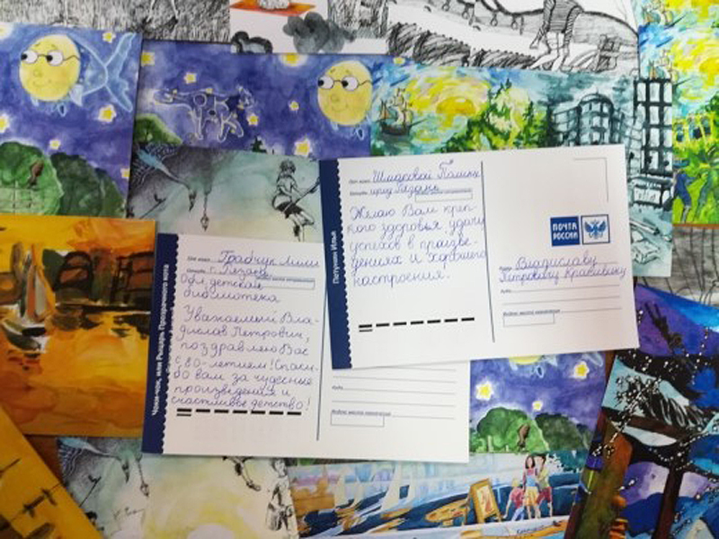 Эскизы для поздравительных открыток по произведениям Владислава Крапивина создали учащиеся художественного отделения Свердловских детской школы искусств №5 и детской художественной школы №1 им. П.П. Чистякова. Открытки при помощи курьерской службы Почты России были доставлены во многие города России, в том числе и в Рязань. Открытки с поздравлениями и пожеланиями рязанских детей вручат Владиславу Петровичу в день его рождения.