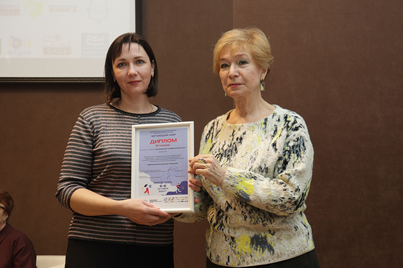 Призы победителям акции “«Читающий мир» на библиотечной полке»” 2022 года вручила директор Рязанской областной библиотеки имени Горького, председатель Общественной палаты Наталья Николаевна Гришина.