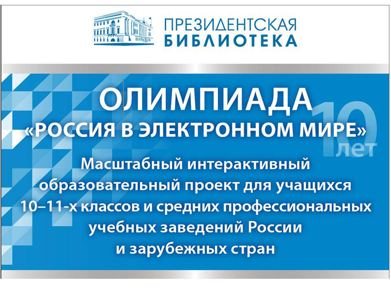 Интернет-олимпиада для школьников «Россия в электронном мире» – это масштабный образовательный проект, реализуемый Президентской библиотекой. Подробная информация об участии в интерактивной школьной олимпиаде по истории, обществознанию и русскому языку размещена на сайте мероприятия.