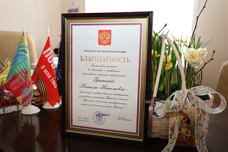 Директор библиотеки имени Горького, председатель региональной Общественной палаты и областного Совета женщин Наталья Николаевна Гришина удостоена Благодарности Президента Российской Федерации за активное участие в подготовке и проведении общественно значимых мероприятий.