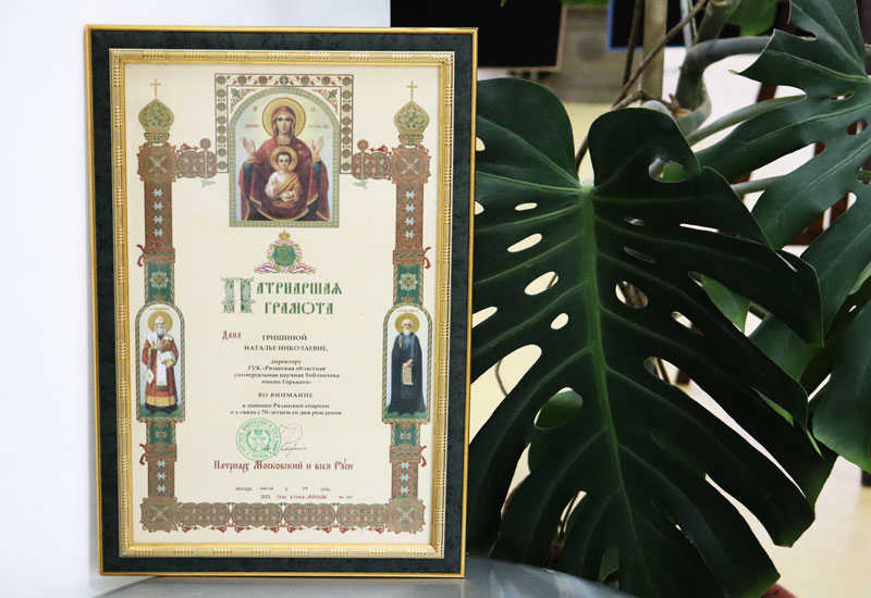 В день государственной памятной даты – Крещения Руси – Митрополит Рязанский и Михайловский Марк вручил Патриаршую грамоту директору Рязанской областной универсальной научной библиотеки имени Горького Наталье Николаевне Гришиной. Высокая награда за подписью Патриарха Московского и всея Руси Кирилла вручена во внимание к помощи Рязанской епархии и в связи с юбилейной датой со дня рождения. Вручение состоялось на церемонии открытия выставки работ фотохудожника Костаса Асимиса (Греция) «Наш Афон», прошедшей в областной библиотеке имени Горького.