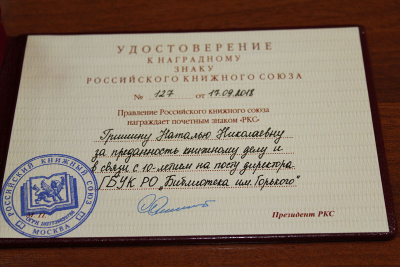21 сентября директору Рязанской областной универсальной научной библиотеки имени Горького Наталье Николаевне Гришиной был вручен наградной знак Российского книжного союза.