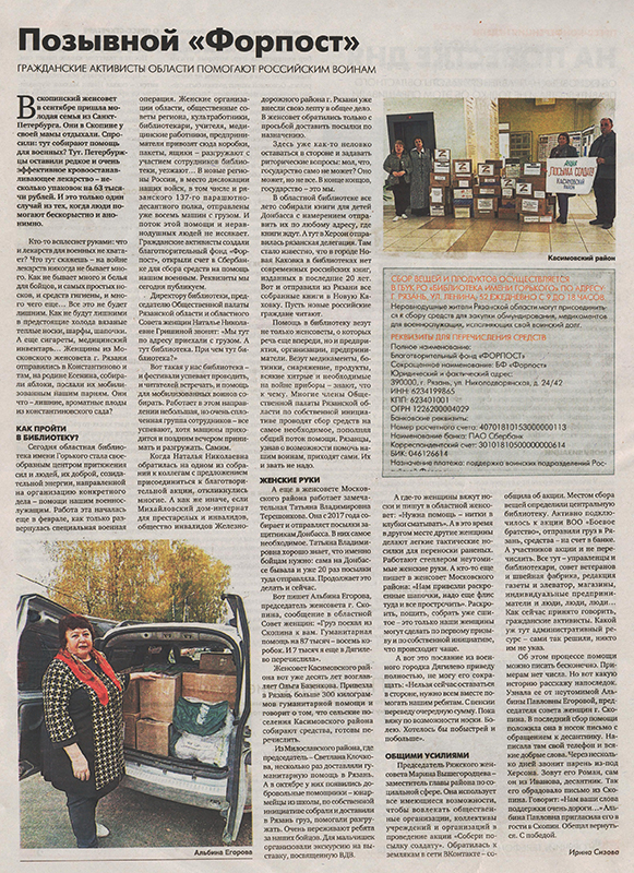 Рязанская областная общественно-политическая газета «Рязанские ведомости» опубликовала материал о работе областного Совета женщин по поддержке воинских подразделений Российской Федерации.