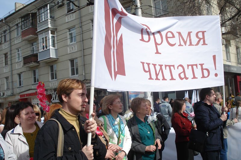 Флаги с символикой библиотеки, большой транспарант «Время читать!», цветы, улыбки, песни – все это сопровождало библиотекарей во время прохождения по улицам города и создало весенний, боевой настрой на продолжение активной работы по продвижению книги, чтения, развитию библиотеки как крупного научного, информационного, образовательного, методического центра, центра культурного притяжения, места просвещенного досуга.