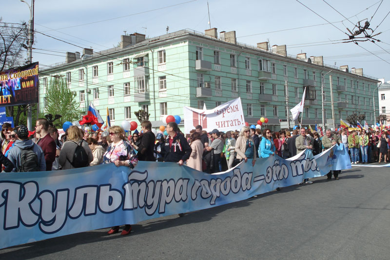 В огромной колонне участников праздничной демонстрации значительное место заняли работники культуры региона и среди них – сотрудники областной библиотеки имени Горького.