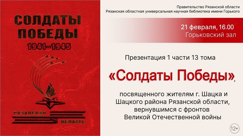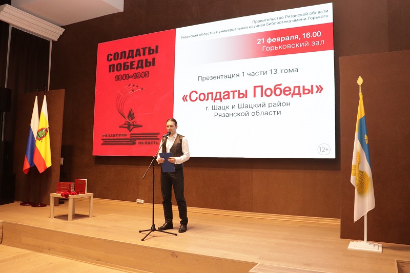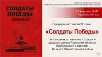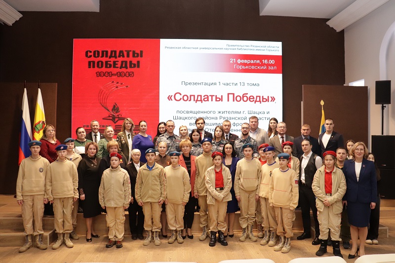 21 февраля состоялась презентация первой книги 13 тома издания «Солдаты Победы. 1941–1945», посвященного уроженцам города Шацка и Шацкого района Рязанской области – участникам Великой Отечественной войны, вернувшимся с фронта с Победой. Ее участниками стали члены рабочей и редакционной группы книги «Солдаты Победы. 1941–1945», сотрудники библиотек, краеведы, представители молодежных организаций Рязанской области. Велась прямая трансляция встречи на портале Культура.РФ.