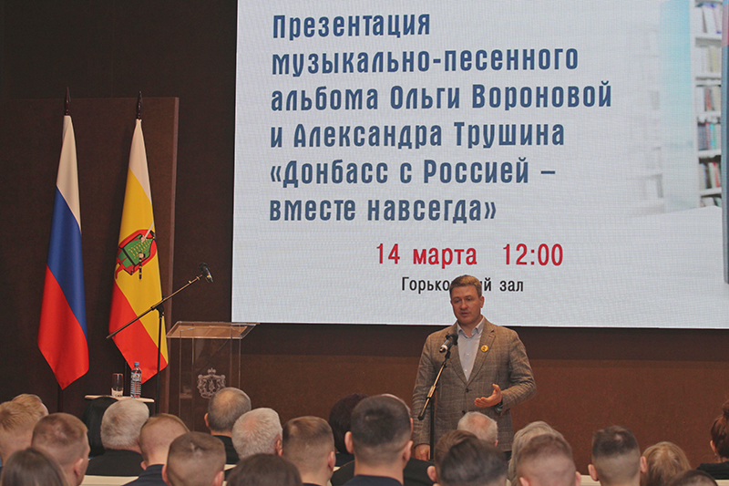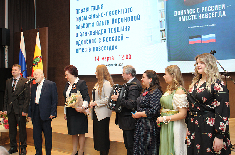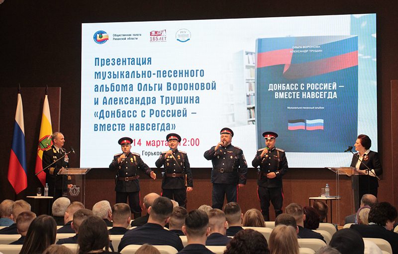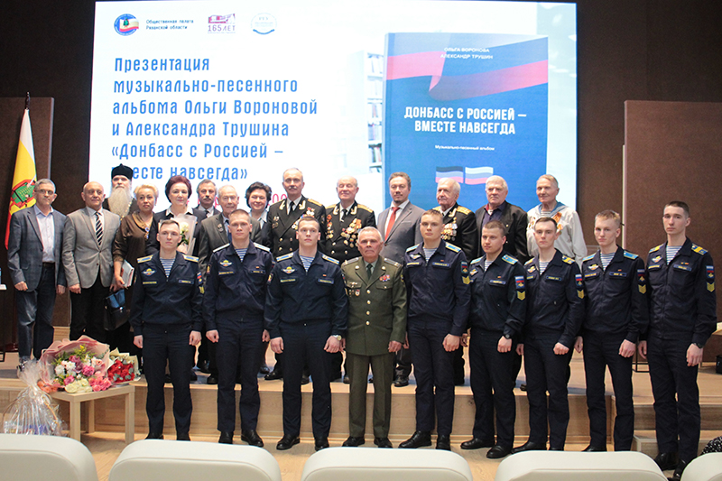 В библиотеке Горького состоялась презентация нового сборника Ольги Вороновой и Александра Трушина «Донбасс с Россией – вместе навсегда». Музыкально-песенный альбом, посвященный специальной военной операции и героической борьбе народа Донбасса, издан РОУНБ им. Горького при поддержке Правительства Рязанской области, Общественной палаты Рязанской области.