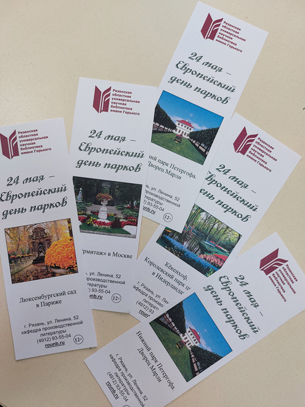 В ходе библиотечной акции рязанцы узнали о самых красивых и знаменитых европейских парках, среди которых заслуженной мировой популярностью пользуются парки Москвы и Санкт-Петербурга. Читателям библиотеки и прохожим были предложены книжные закладки с интересной информацией о «зеленых жемчужинах» России и Европы.