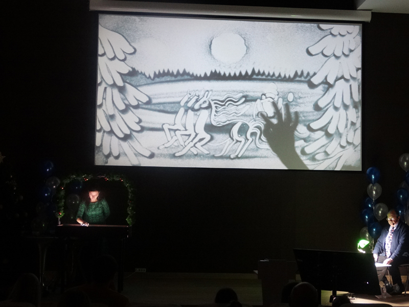 В преддверии Нового года в Горьковском зале библиотеки дети и взрослые посмотрели песочный спектакль «Новогодняя сказка» театра песка «Брим».