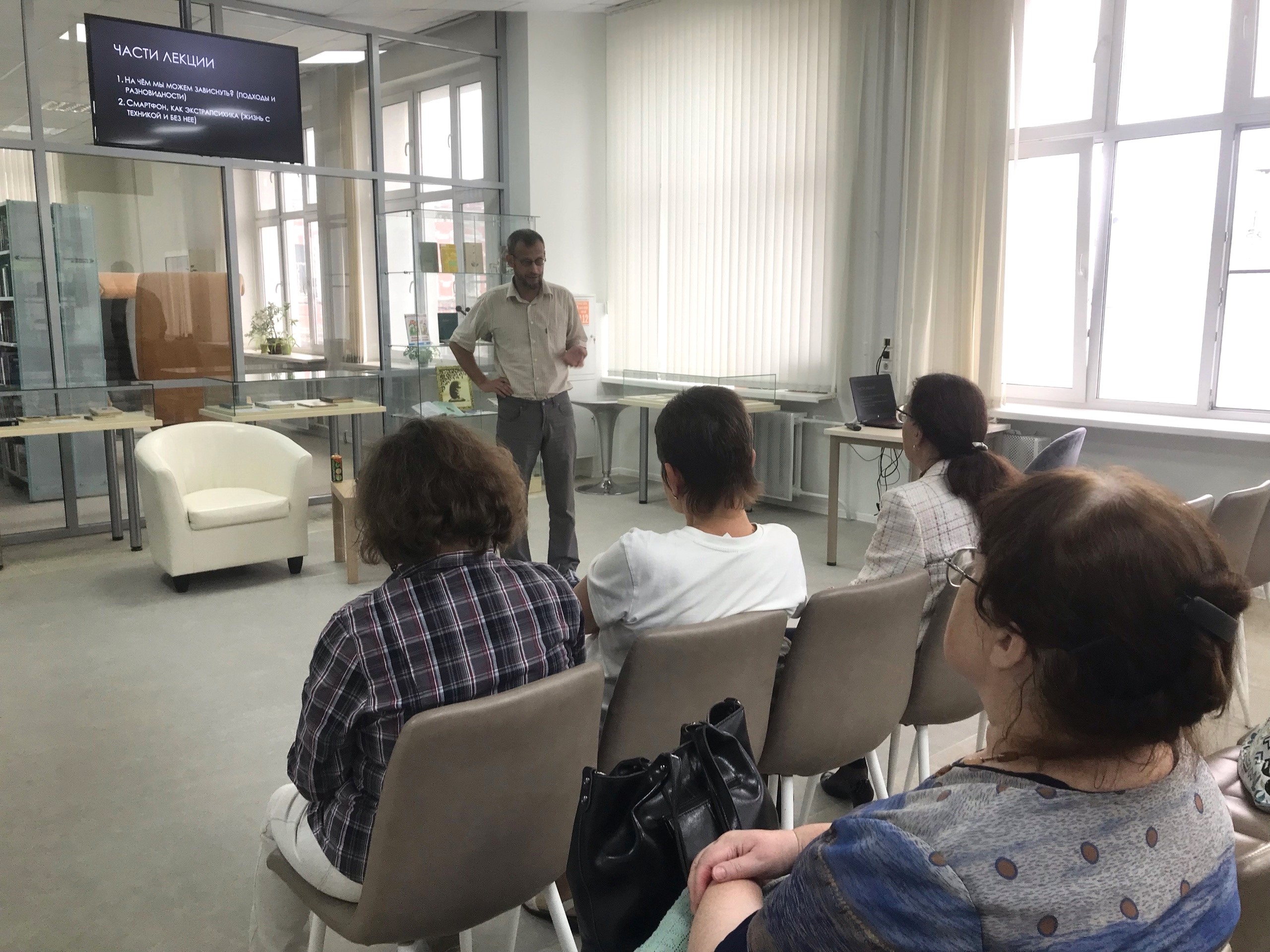 В библиотеке имени Горького 8 августа прошла очередная встреча в рамках социального проекта – цикла интерактивных лекций «Психологическая поддержка семьи в условиях повышенной напряженности, мировой нестабильности и перемен». Вторую часть лекции «Зависимость от гаджетов: смартфон как экстрапсихика (про жизнь с техникой и без нее)» прочитал кандидат философских наук, доцент, психолог, психодраматист Роман Шутов.