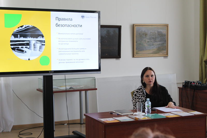 Сегодняшний семинар провела Анна Геннадьевна Зотова, специалист Рязанского отделения Банка России. Отдельное внимание было уделено правилам безопасности при заключении банковского договора: важно изучить, с кем и на какой срок заключается договор, гарантируется ли доходность, где посмотреть статистику погашения кредита. В случае нарушения прав специалист советовала обратиться в интернет-приемную Банка России.