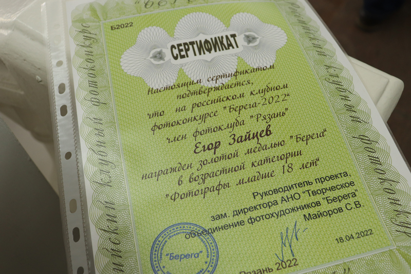 Директор автономной некоммерческой организации «Творческое объединение фотохудожников “Берега”», фотограф Николай Владимирович Середа в торжественной обстановке наградил молодого автора, рязанца Егора Зайцева и главного библиотекаря отдела хранения основного фонда библиотеки им Горького Ирину Леонову медалями и почетными грамотами.